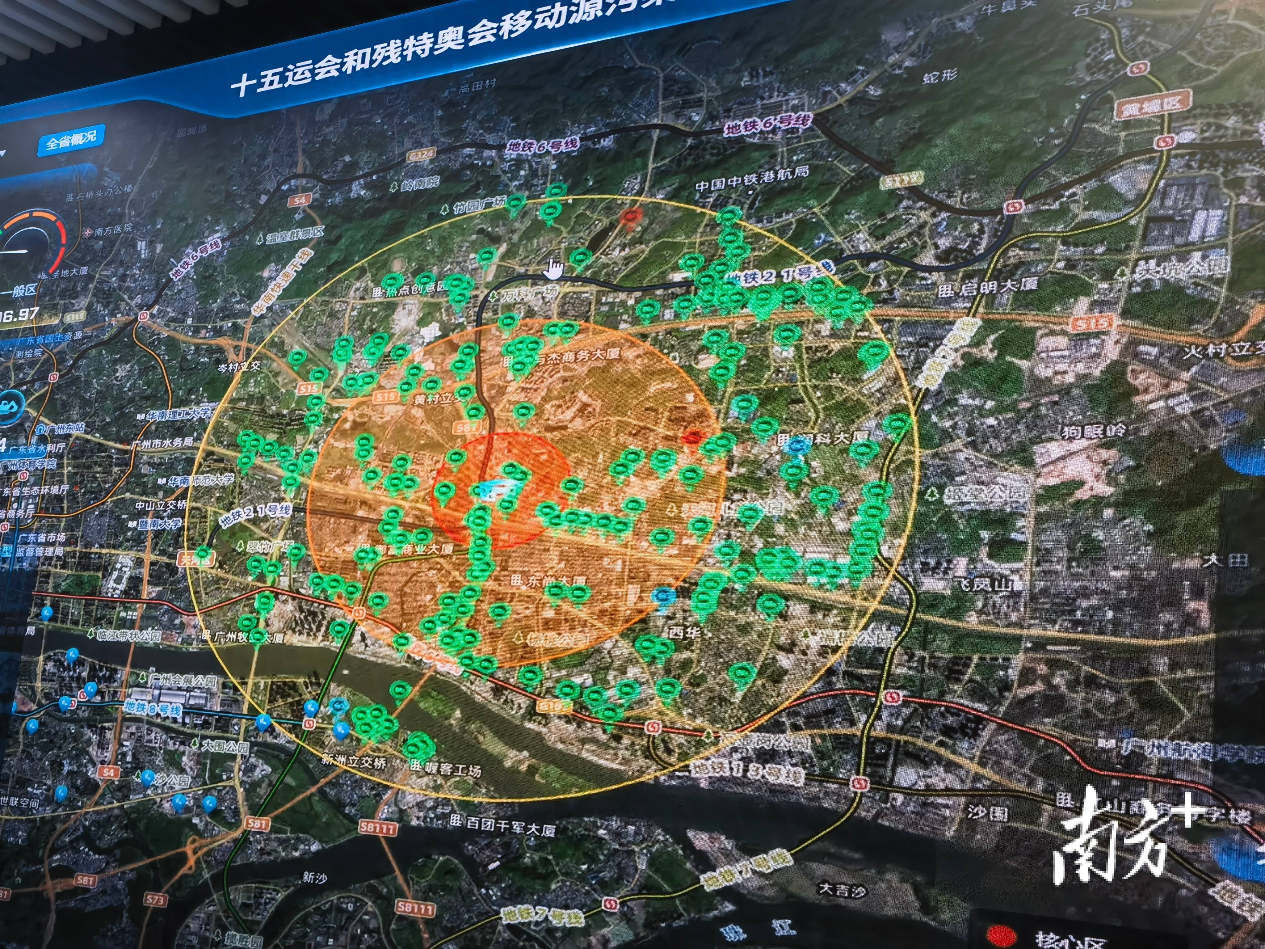 “十五运会和残特奥会移动源污染物实时监控系统监测显示,11时34分有2辆NOx(氮氧化物)高排放货车进入奥体中心的一般排放区,该车辆信息马上通过‘天地车人’APP推送到地市生态环境部门工作人员依法处理。”广东省生态环境厅大气处负责人盯着大屏幕介绍。记者看到,屏幕上以奥体中心为中心,划分出核心区、重点区、一般区三个圈层,实时监控货车等移动源的污染物排放。