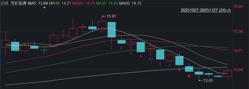 二级市场上,兖矿能源今日收盘上涨1.6%,全天成交4.37亿元,换手率0.53%。值得注意的是,兖矿能源股价在11月10日盘中创下15.91元的一年新高后便开始连续下行。11月10日至11月27日收盘,兖矿能源股价在14个交易日已累计下跌9.33%。